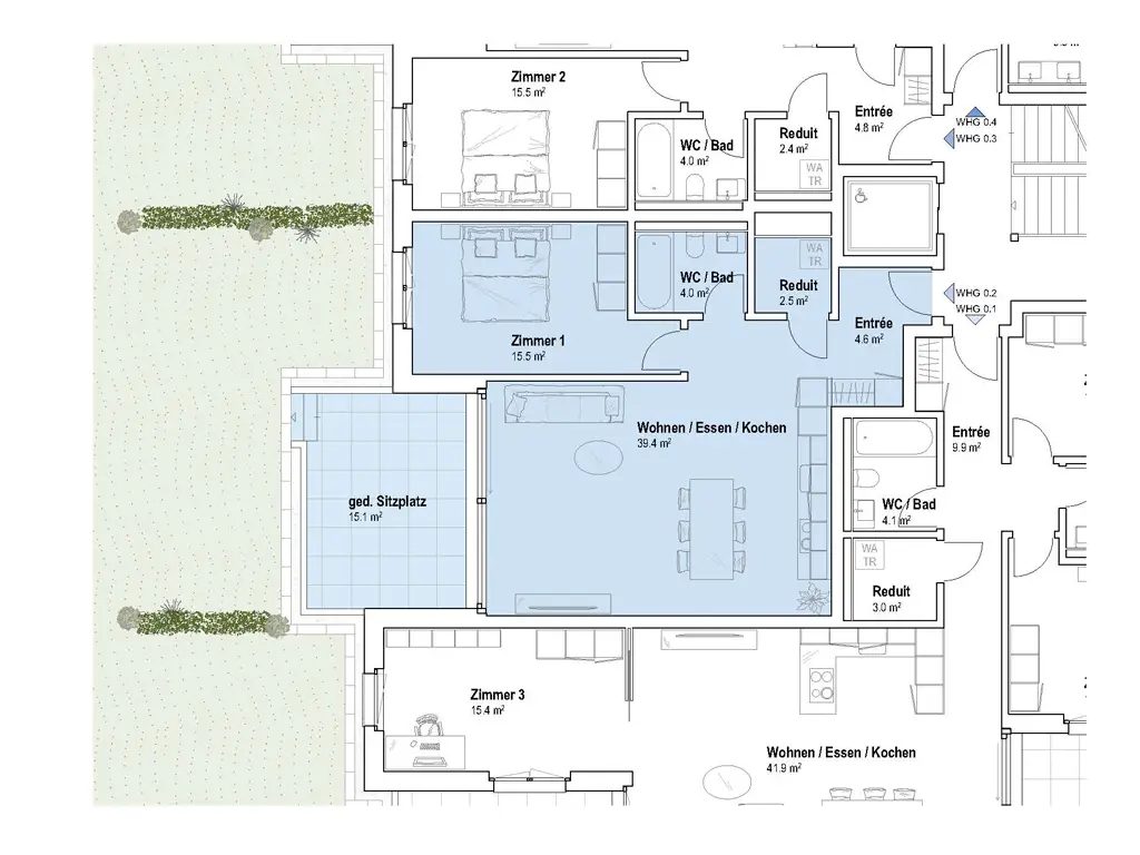 • eigener Gartenanteil direkt bei der Wohnung und gedeckter Sitzplatz